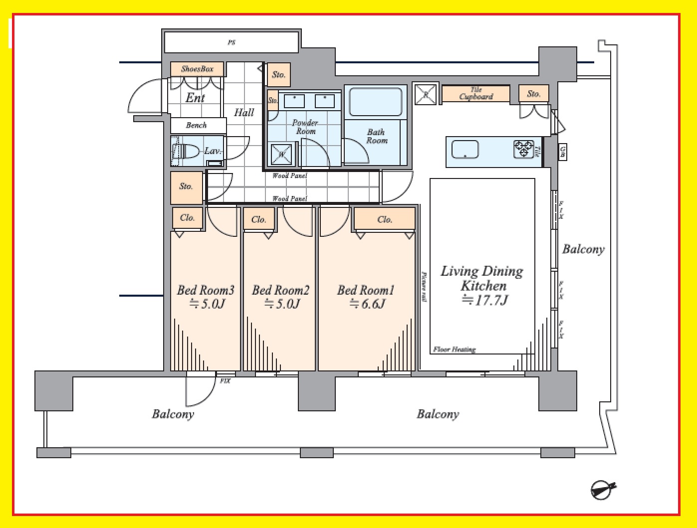 2面バルコニー