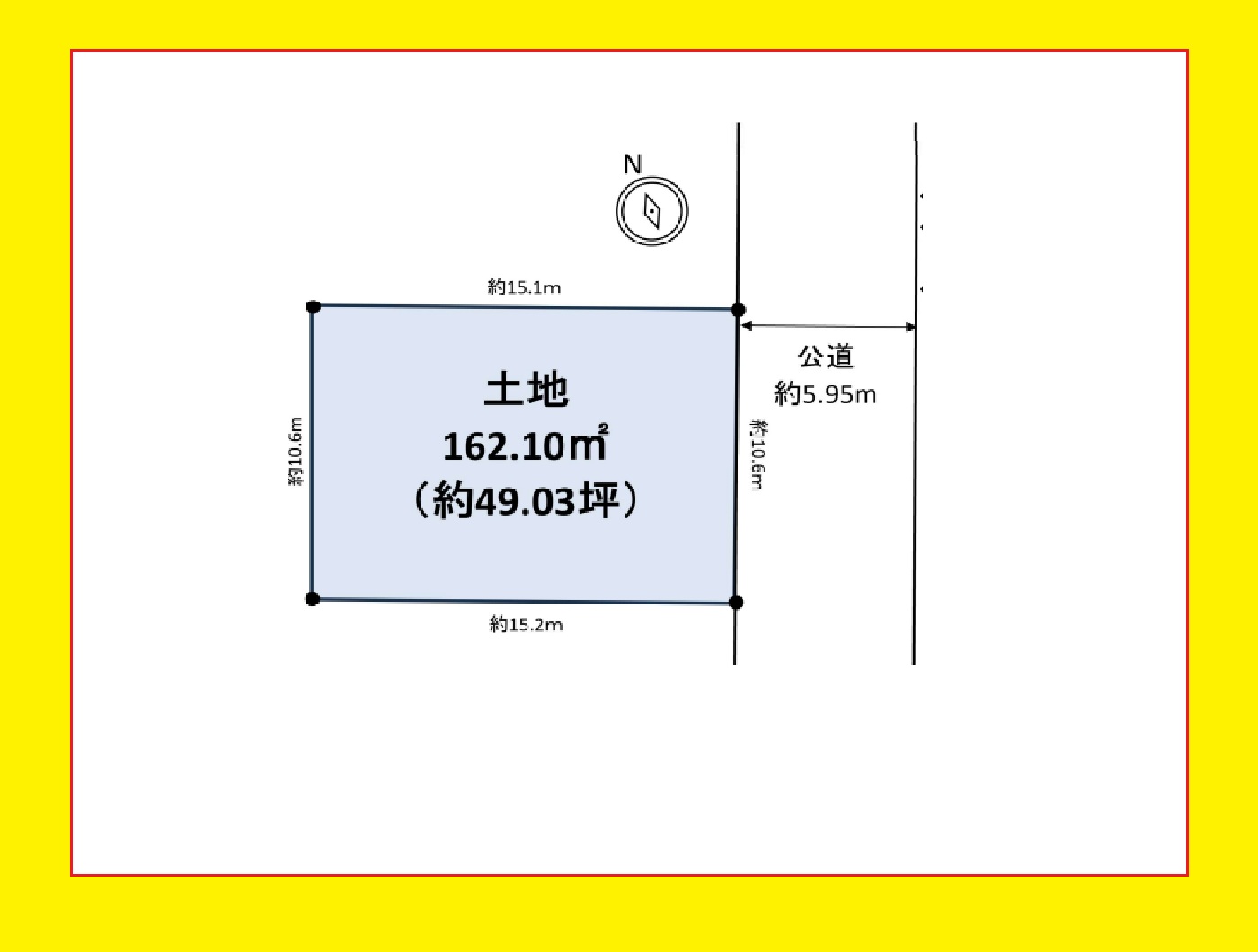 間口10.6m。東南側5.9m公道。